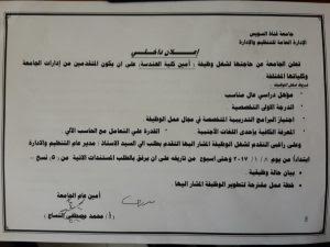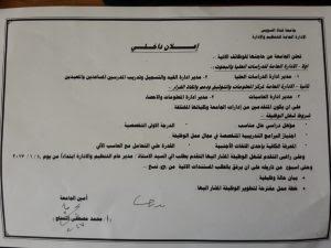 وعلى راغبى التقدم لشغل الوظيفة المشار اليها التقدم بطلب الى السيد الأستاذ / مدير عام التنظيم والإدارة ابتداءاً من يوم 8/1/2017 وحتى اسبوع من تاريخه على ان يرفق بالطلب المستندات الأتية من (5) نسخ :-