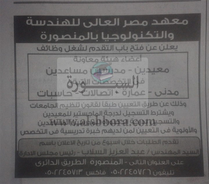 يعلن معهد مصر العالى للهندسة والتكنولوجيا بالمنصورة عن حاجته الى معيدين ومدرسين مساعدين، وعلى الراغبين فى التقدم تقديم الطلبات خلال اسبوع من تاريخ نشر الاعلان باسم المهندس عبدالعزيز السلاب.