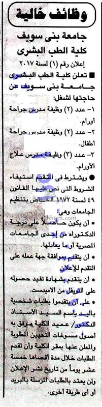 تعلن جامعة بنى سويف عن حاجتها الى أعضاء هيئة التدريس، وعلى الراغبين فى الحصول على الوظيفة تقديم الطلبات بايد باسم السيد الاستاذ الدكتور عميد الكلية خلال 15 يوما من تاريخ نشر الاعلان فى جريدة الجمهورية اليوم السبت الموافق 14 يناير 2017.