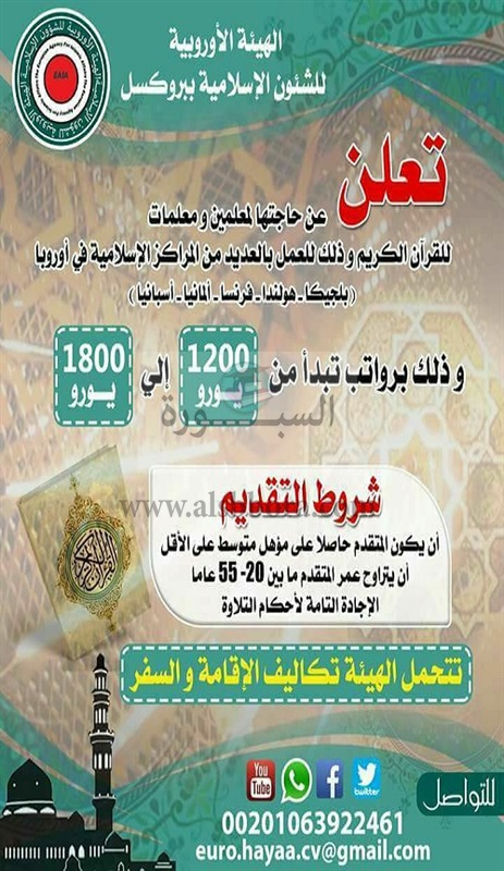 تعلن الهيئة الاوروبية للشئون الاسلامية ببروكسل للعمل بالعديد من المراكز الاوروبية الاسلامية بدول "بلحيكا، وهولندا، وفرنسا، وألمانيا، وإسبانيا" عن حاجتها الى معلمين ومعلمات، وعلى الراغبين فى التقدم التواصل عبر رقم التليفون المنشور فى الاعلان التالى: