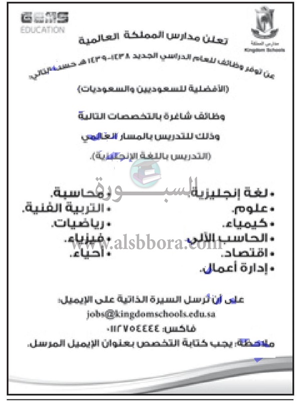 تعلن مدارس المملكة العالمية بالمملكة العربية السعودية عن حاجتها الى معلمين، وعلى الراغبين فى التقدم ارسال السيرة الذاتية على الايميل المنشور فى الاعلان التالى: