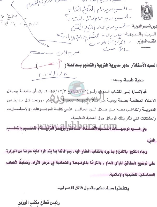 بناء على تعليمات الدكتور الهلالي الشربيني وزير التربية والتعليم والتعليم الفني،أرسلت الوزارة خطابا عاجلا للمديريات التعليمية، شددت خلاله على المديريات بضرورة متابعة وسائل الإعلام المختلفة بصفة يومية،مشيرةً إلى ضرورة موافاة الوزارة بكل ما يتم الرد عليه حرصا على توضيح الحقائق للرأي العام ، والتزامًا بالموضوعية والشفافية في عرض الآراء ، وتحقيقا لأهداف السياستين التعليمية والإعلامية