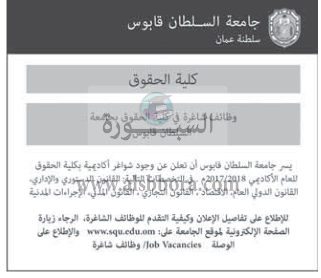 اعلنت جامعة السلطان قابوس بسلطنة عمان عن حاجتها الى أعضاء هيئة التدريس، وعلى الراغبين فى التقدم زيارة الصفحة الالكترونية لموقع الجامعة اضغط هناااااا