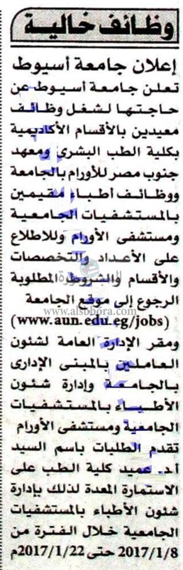 أعلنت جامعة أسيوط عن حاجتها للتعاقد مع ّأعضاء هيئة التدريس جدد في عدد من التخصصات علي أن يكون أخر موعد للتقديم غدا الأحد 22 يناير وفقا لنص الإعلان التالي: