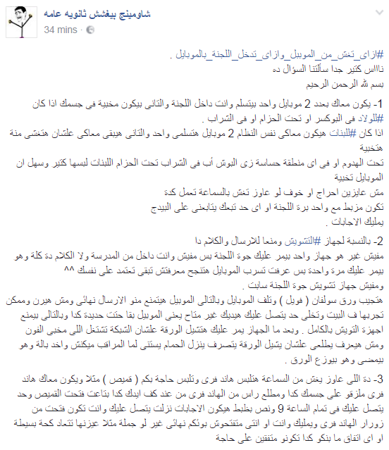 تتحدى صفحة "شاومينج بيغشش ثانوية عامة"، وزارة التربية والتعليم، بنشر طريقة الغش من الهاتف المحمول، وكيفية إدخال الطالب للهاتف إلى اللجنة، ليتمكن من الغش عن طريقه.