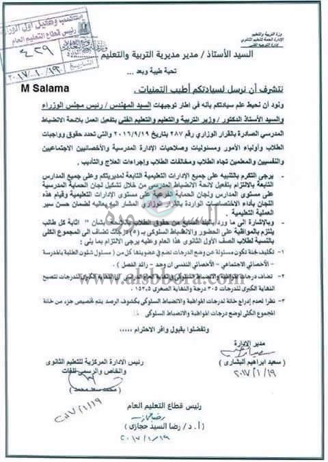 ننشر القرار 287 بشأن إضافة 5 درجات عن الانضباط المدرسى لطلاب الصف الأول الثانوى