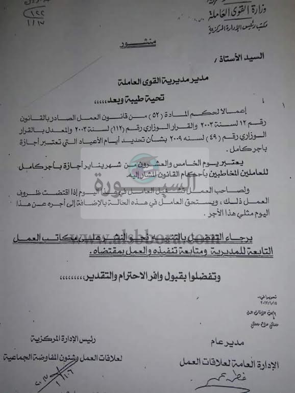بالمستندات| القوى العاملة: غدا إجازة بأجر كامل لجميع العاملين بالدولة والقطاع الخاص