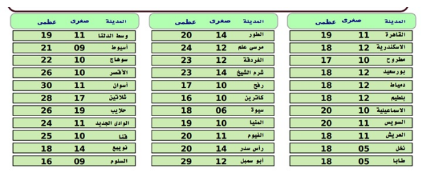 توقع خبراء هيئة الأرصاد الجوية أن تميل درجات الحرارة نحو الانخفاض، غدا الخميس، ليسود طقس معتدل شمالا حتى شمال الصعيد دافئ على جنوب الصعيد نهارا شديد البرودة ليلا.