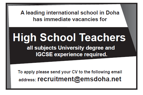 تعلن مدرسة دولية بقطر عن حاجتها الى معلمين، وعلى الراغبين فى التقدم ارسال السيرة الذاتية على الايميل المنشور فى الاعلان التالى: