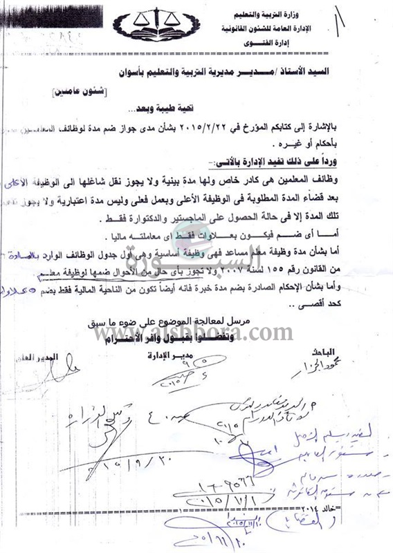 بالمستندات| لا يجوز ضم مدة معلم مساعد الى وظيفة معلم.. وضم مدة الخبرة من الناحية المالية بحد أقصى 5 علاوات
