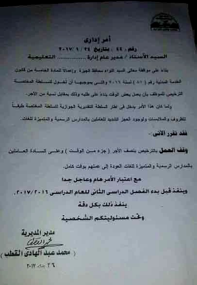 قام السيد مدير مديرية التربية والتعليم بالجيزة باصدار أمر ادارى رقم 44 بتاريخ 24 يناير 2017 ، يوصى بوقف العمل بالترخيص بنصف الأجر "جزء من الوقت"، ومطالبة العاملين بالمدارس الرسمية والمتميزة للغات العودة إلى عملهم بوقت كامل.