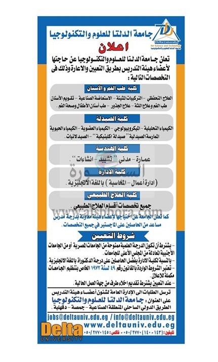 اعلنت جامعة الدلتا للعلوم والتكنولوجيا عن وظائف شاغرة لأعضاء هيئة التدريس"من معيد الي أستاذ" بطريق التعيين أو الاعارة وذلك في كليات " طب الفم والاسنان – الصيدلة – الهندسة – الادارة – العلاج الطبيعي "للتسجيل مباشرة أضغط هنا