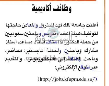تعلن جامعة الملك فهد عن وظائف جديدة لأعضاء هيئة التدريس "من حملة الماجستير والدكتوراه" وذلك وفقا لنص الإعلان