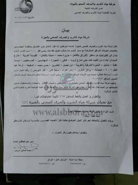 وقالت الشركة، فى بيان لها: «إنه نظرًا لأعمال مترو الأنفاق بمنطقة المهندسين بخصوص تحويلات المرافق المتعارضة مع مسار المترو مما يستلزم تحويل خط مياه رئيسي قطر 1000سم ، الأمر الذي يؤدى إلى قطع المياه عن مناطق الوراق بالكامل، جزيرة محمد، إمبابة بالكامل، القومية العربية، شارع السودان ابتداء من الكيت كات حتى شارع ثروت، الدقى، العجوزة، المهندسين، الصحفيين، ميت عقبة، بشتيل، المنيرة الشرقية والغربية، أول فيصل، العشرين، حسن محمد، المطبعة، ترعة عبدالعال، المشابك، بولاق الدكرور، أرض اللواء، صفط اللبن، كفر طهرمس".