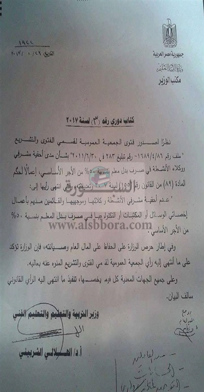 ينشر موقع السبورة الكتاب الدورى رقم 3 لسنة 2017 بتاريخ " 29 يناير 2017 بشأن عدم احقية مشرفى الانشطة ووكلائها وموجهيها، والقائمين باعمال اخصائى للوسائل واخصائى للمكتبات والتكنولوجيا فى صرف بدل معلم والذى نسبته 50% من الراتب الاساسى للاخصائى، غير الخاضعين للقانون رقم 155 لسنة 2007 م وتعديلاته.
