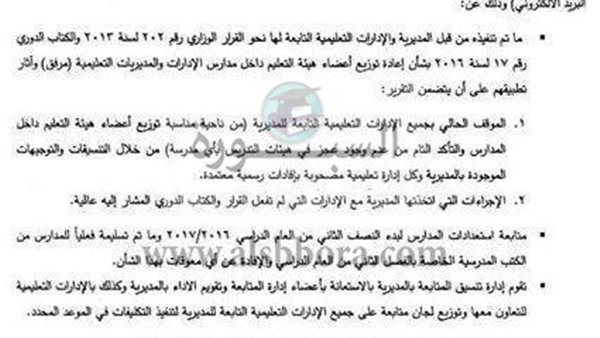 أرسلت الادارة المركزية للتقويم والمتابعة بوزارة التربية والتعليم والتعليم الفنى، تعميم رقم 1 لسنة 2017م بشأن اعداد تقريراً بما تم تنفيذه والاجراءات التي تم اتخاذها والموقف من اعادة توزيع اعضاء هيئة التدريس داخل مدارس الادارات بالمديريات وسد العجز وفق القرار الوزاري رقم (202) لسنة 2013 والكتاب الدوري رقم (17) لسنة 2016 وموقف وصول الكتب واخر الاستعدادات لاستقبال الفصل الدراسي الثاني والاستعانة بلجان المتابعة بالادارات المختلفة لمتابعة تنفيذ التكليفات.