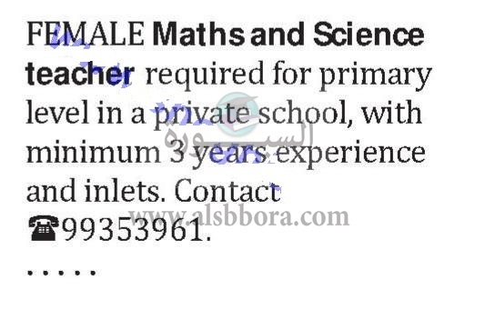 تعلن سلطنة عمان عن حاجتها الى معلمين، وعلى الراغبين فى التقدم الاتصال برقم التليفون المنشور عبر الاعلان التالى: