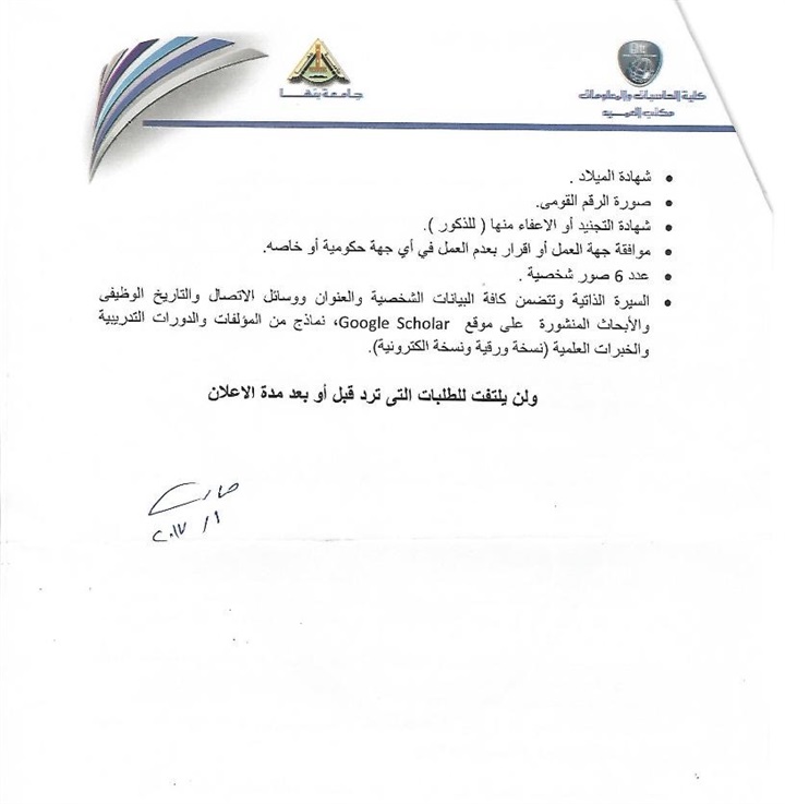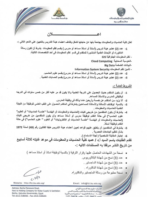 تعلن وزارة التعليم العالى "كلية الحاسبات والمعلومات بجامعة بنها" عن حاجتها لشغل وظائف أعضاء هيئة التدريس ، من عدد من الوظائف بالكلية الحاسبات والمعلومات وفقا للاعلان التالى :