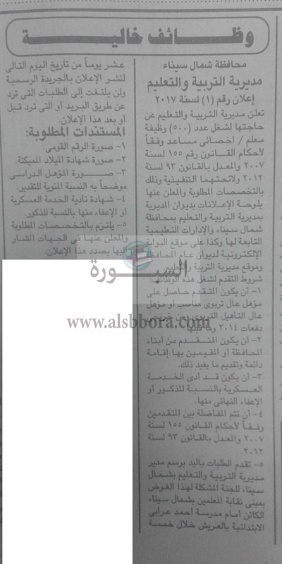 تعلن مديرية التربية والتعليم بمحافظة شمال سيناء عن حاجتها الى 500 معلم وإخصائى، وعلى الراغبين فى التقدم ارسال الطلبات باليد باسم مدير مديرية التربية والتعليم بشمال سيناء.