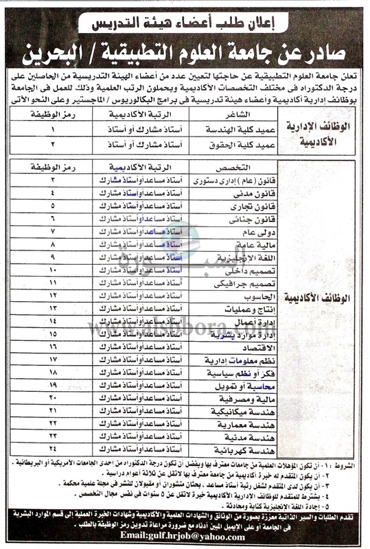 تعلن جامعة العلوم التطبيقية البحرينية عن حاجتها للتعاقد مع أعضاء هيئة تدريس جدد في 24 تخصص وذلك وفقا لنص الإعلان التالي: