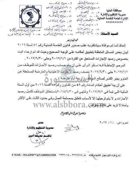 بالمستندات.. التنظيم والادارة: استحقاق المعلمين لنصف الاجازات الاعتيادية والعارضة عن الفترة من 1-1-2017 حتي 30-6-2017 ويجبر الكسر لصالح المعلم"أربعة أيام عارضة "