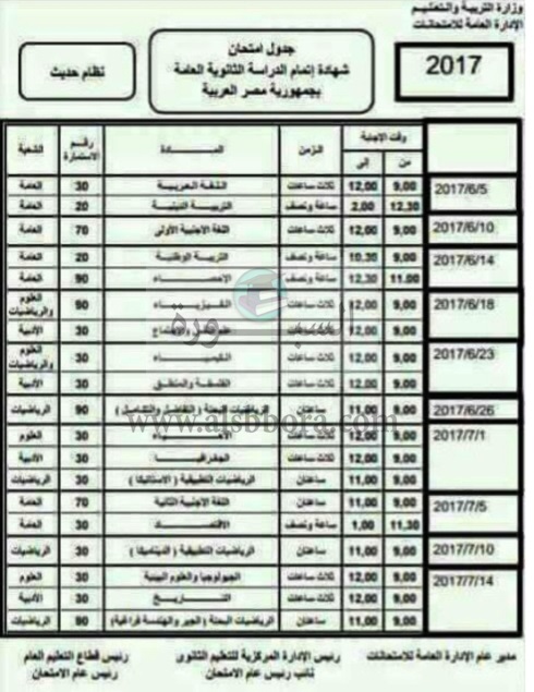 ننشر لطلاب الثانوية العامة الجدول الذى اقترحة وزارة التربية والتعليم لامتحانات الصف الثالث الثانوى للعام 2017 على ان يؤخد فى الاعتبار اراء الطلاب فية للاستقرار على جدول الثانوية العامة 2017 النهائى.
