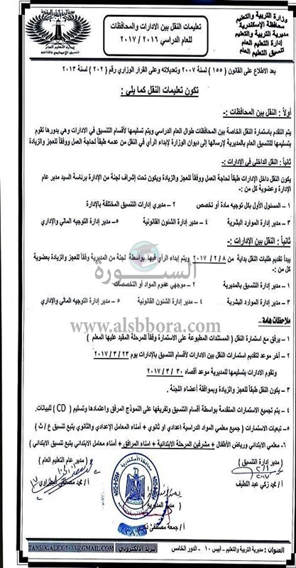 ينشر موقع السبورة النشرة الصادرة من مديرية التربية والتعليم بالاسكندرية بشأن تعليمات النقل بين المحافظات والادارات التعليمية للعام 2016/ 2017م.