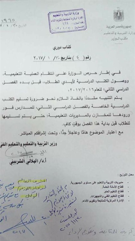أرسلت وزارة التربية والتعليم كتابا دوريا بشأن تسليم الكتب لجميع المدارس قبل بدء الترم الثانى والذى سوف يبدأ 11 فبراير الجارى.