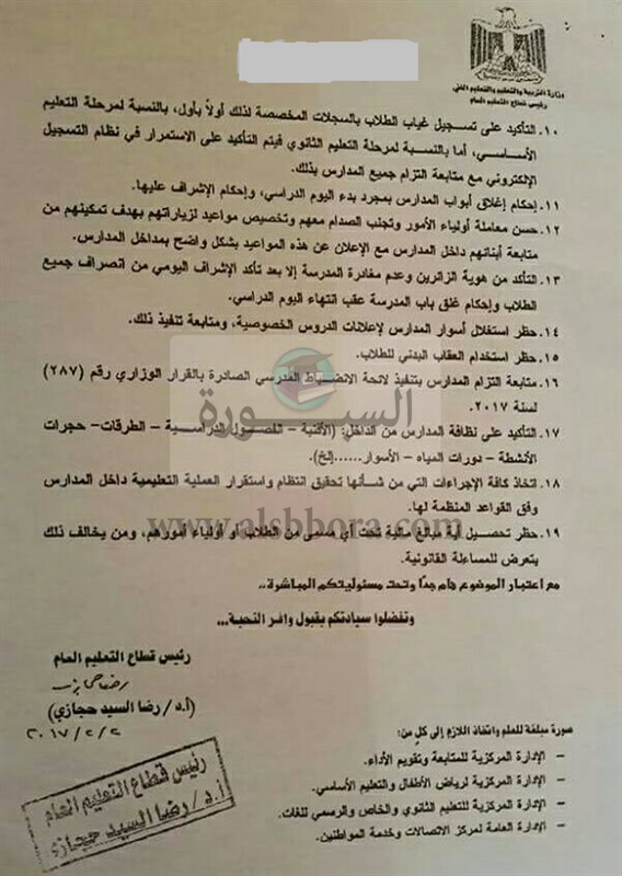 10. التأكيد على تسجيل غياب الطلاب بالسجلات المخصصة لذلك أولاً بأول، بالنسبة لمرحلة التعليم الأساسي، أما بالنسبة لمرحلة التعليم الثانوي فيتم التأكيد على الاستمرار في نظام التسجيل الإلكتروني مع متابعة التزام جميع المدارس بذلك.