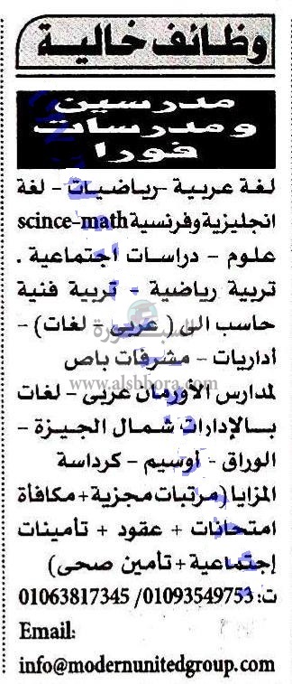 تعلن كبرى المدارس بجمهورية مصر العربية عن حاجتها الى مدرسين ومدرسات فى جميع التخصصات، وعلى الراغبين فى التقدم ارسال السيرة الذاتية عبر الايميل المنشور فى جريدة الأهرام اليوم الأربعاء الموافق 8 فبراير 2017.