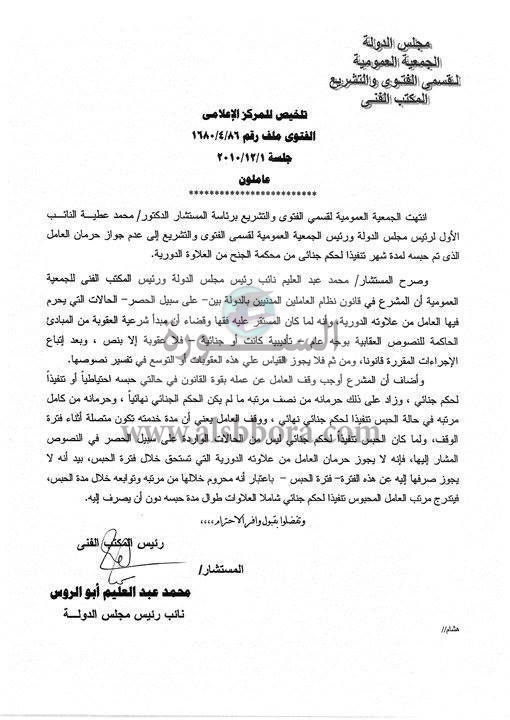 ينشر موقع "السبورة" فتوى الجمعية العمومية لقسمي الفتوي والتشريع بمجلس الدولة بشأن عدم جواز حرمان العامل الذي تم حبسه من العلاوة الدورية فيتدرج مرتب العامل المحبوس تنفيذا لحكم جنائي شاملاً العلاوات طوال مدة حبسه دون ان يصرف إليه.