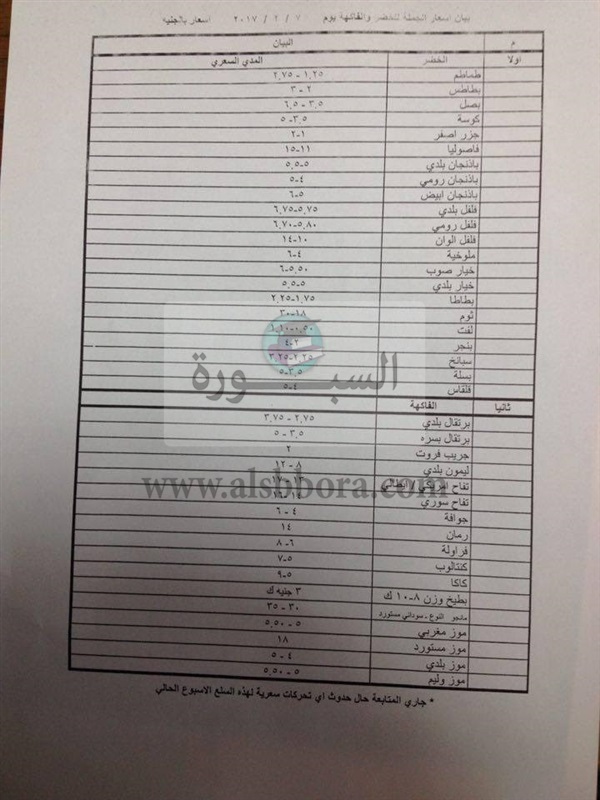 ينشر موقع"السبورة"، اليوم الاربعاء، اسعار الخضروات والفاكهة