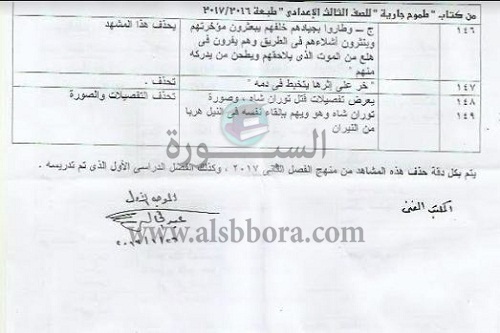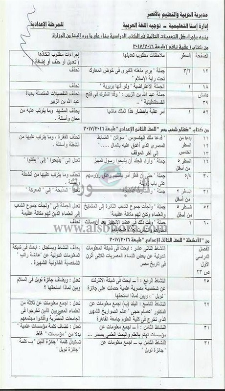 أرسلت وزارة التربية والتعليم منشوارت تفيد حذف وإضافة وتعديل ببعض الكتب المدرسية مثل كتاب (كفاح شعب مصر، الانشطة للصف الثالث الاعدادى، عقبة بن نافع، طموح جارية) الغريب فى الأمر مطالبة توجية اللغة العربية والتربية الدينية بحذف بعض الجمل من كتب الفصل الدراسى الأول الذى تم تدريسه.