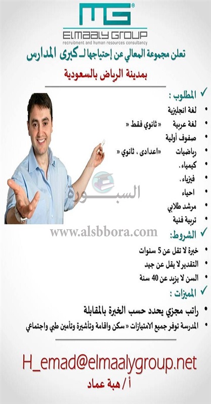 تعلن كبرى الشركات المسئولة عن توظيف المعلمين عن حاجتها الى معلمين مصريين للعمل بالرياض بالمملكة العربية السعودية، وعلى الراغبين فى التقدم ارسال السيرة الذاتية عبر الايميل المنشور فى الاعلان التالى: