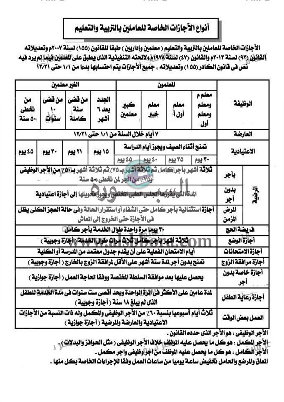 بالمستندات.. تعرف علي الإجازات الخاصة بالمعلمين والإداريين والعاملين بالتربية والتعليم "بأجر وبدون أجر ومرافقة الزوج والوضع ورعاية الطفل"