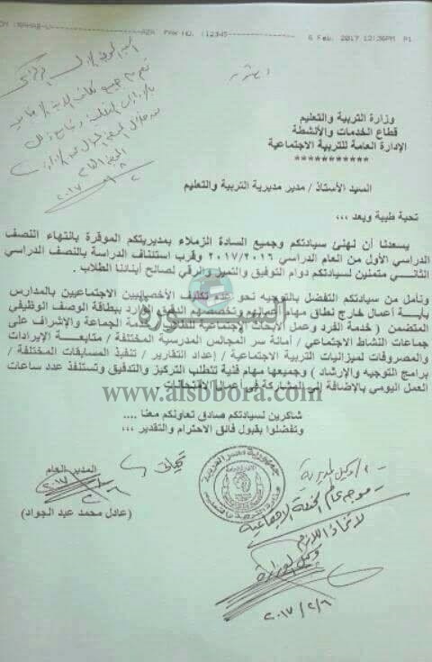 ارسلت وزارة التربية والتعليم والتعليم الفنى فاكسا الى مديريات التربية والتعليم تحذر فيها اسناد مهام الى الاخصائيين الاجتماعيين فى المدارس بغير الأعمال المنوط بهم والواردة فى الوصف الوظيفى لهم.