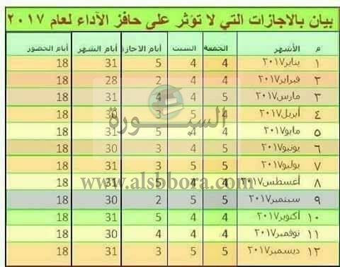 ينشر موقع السبورة بيان بإجازات المعلمين التى لا تؤثر على حافز الآداء لعام 2017، والتى يتطلب من المعلمين توقيع 18 يوما فى الشهر دون المساس بحافز الآداء.