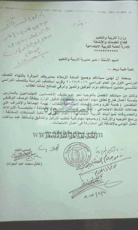 ينشر موقع "السبورة"، بيان عاجل صادر من الادارة العامة للتربية الاجتماعية بعدم تكليف الاخصائى الاجتماعى بأى مهام او أعمال خارج نطاق عمله الاساسى.