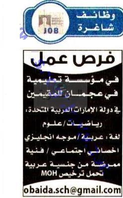 تعلن مدرسة خاصة في دولة الإمارات العربية المتحدة عن حاجتها للتعاقد مع معلمين وذلك في المواد الواردة في نص الإعلان التالي: