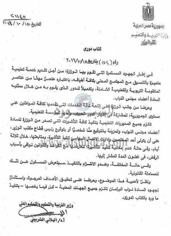 ووفقا للكتاب الدوري الذي أصدره الوزير