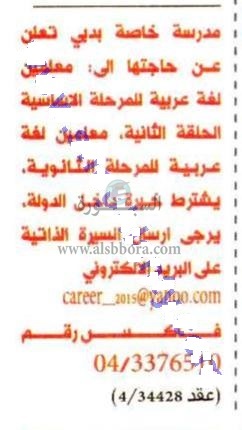 تعلن احدى المدارس الخاصة بدولة الامارات العربية المتحدة الى حاجتها لمعلمين، وعلى الراغبين فى التقدم ارسال السيرة الذاتية عبر الايميل المنشور فى الاعلان التالى: