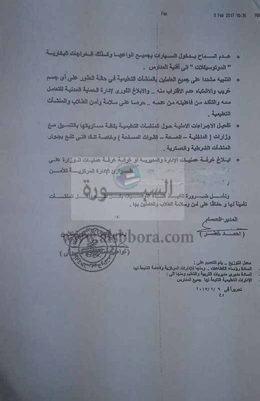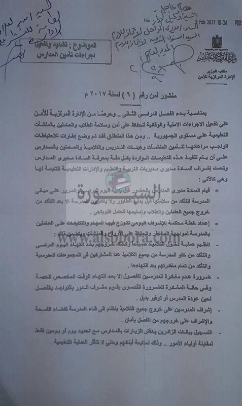 أصدرت الادارة المركزية للأمن بوزارة التربية والتعليم العديد من التعليمات الخاصة بشأن بدء الترم الثانى من العام الدراسى 2017/2016، حيث نبهت على مديرى المدارس بالحضور قبل بداية اليوم الدارسى والمرور على مبانى المدرسة للتأكد من سلامتها قبل بداية الطابور ولا يغادرون المدرسة الا بعد التأكد من خروج جميع العاملين والطلاب وتسليمها للعامل النوبتجى.