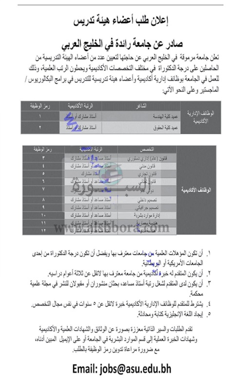 تعلن جامعة خليجية عن وظائف جديدة لأعضاء هيئة التدريس "من معيد إلي أستاذ" في 12 تخصص.