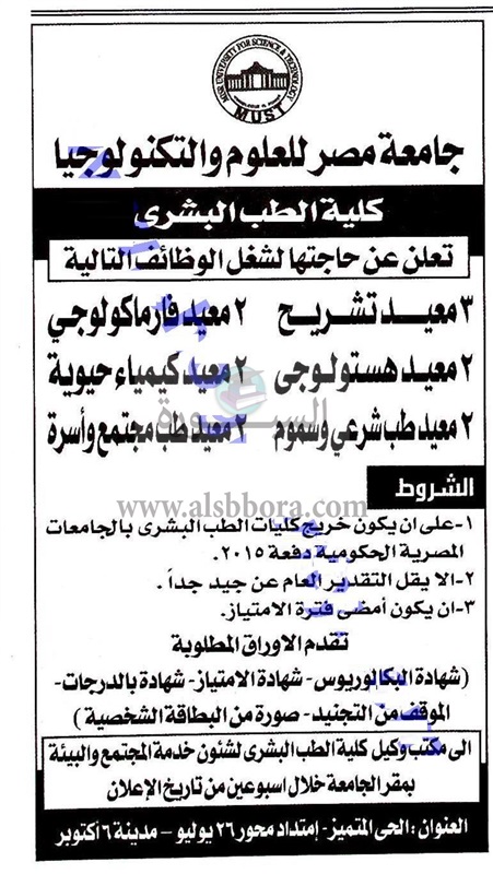 تعلن جامعة مصر للعلوم والتكنولوجيا عن وظائف جديدة لأعضاء هيئة التدريس "من معيد إلي أستاذ" .