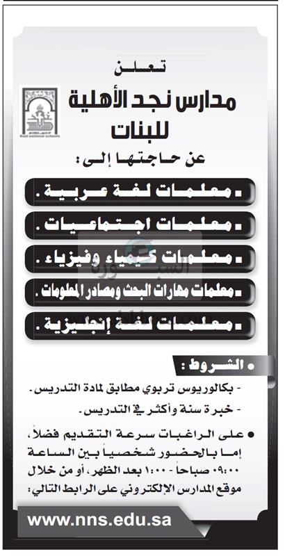 تعلن مدارس نجد الأهلية في المملكة العربية السعودية عن حاجتها للتعاقد مع معلمين ومعلمات جدد وذلك في المواد الواردة في نص الإعلان التالي: