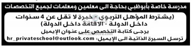 تعلن مدرسة خاصة في أبوظبي عن حاجتها للتعاقد مع معلمين ومعلمات جدد في جميع المواد الواردة وفقا لنص الإعلان التالي: