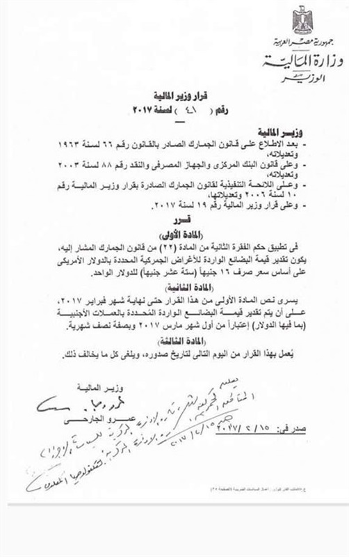 اصدر وزير المالية قرار رقم 41 لسنة 2017 الخاص بخفض الدولار الجمركى لـ 16 جنيهًا بدءًا من غدا الخميس.