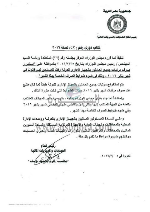 تنشر "السبورة" الكتاب الدوري رقم 23 والخاص بقواعد صرف مرتبات العاملين بالدولة لشهر مارس المقبل.