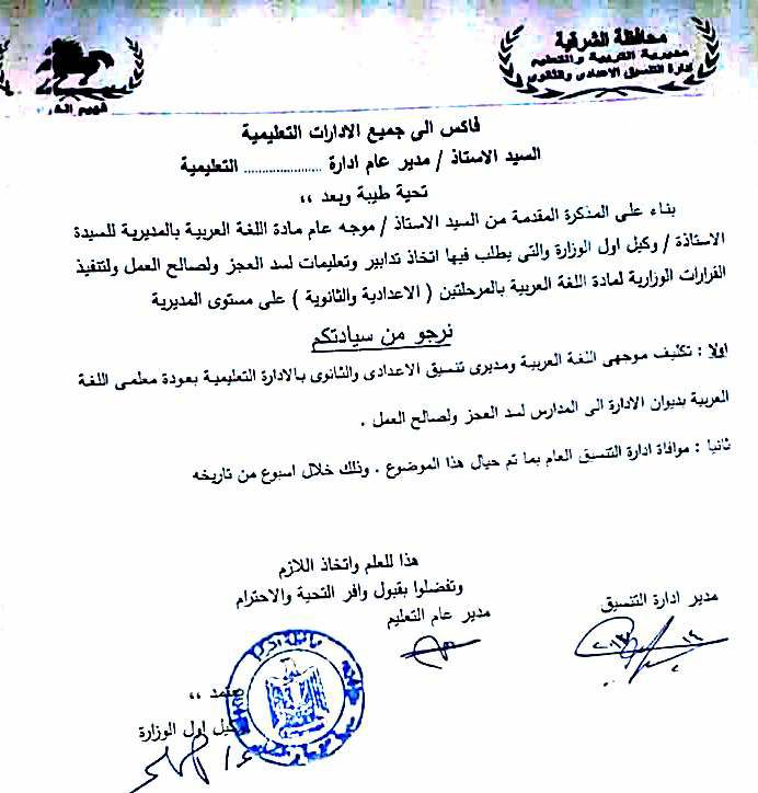 ارسلت ادارة تعليم الشرقية فاكس الى كافة المديريات يشدد على سرعة سد العجز وعودة معلمي اللغة العربية الملحقين بالادارات التعليمية للمدارس لصالح العمل