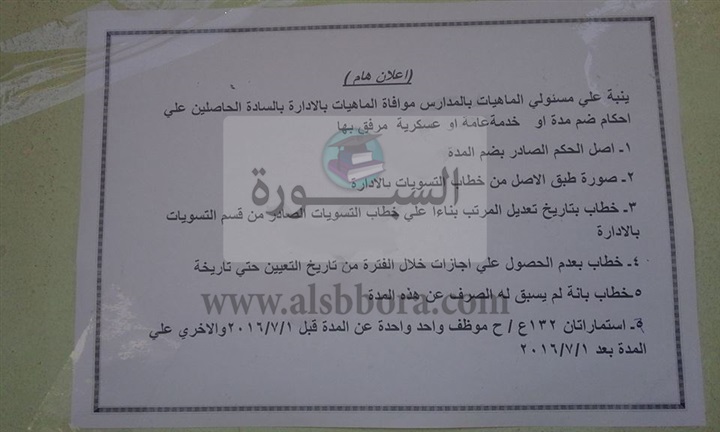 أرسلت وزارة التربية والتعليم اعلان هام لجميع مسئولى الماهيات بالمدارس بموافاة الماهيات بالادارة بالحاصلين على احكام ضم مدة أو خدمة عامة أو عسكرية.